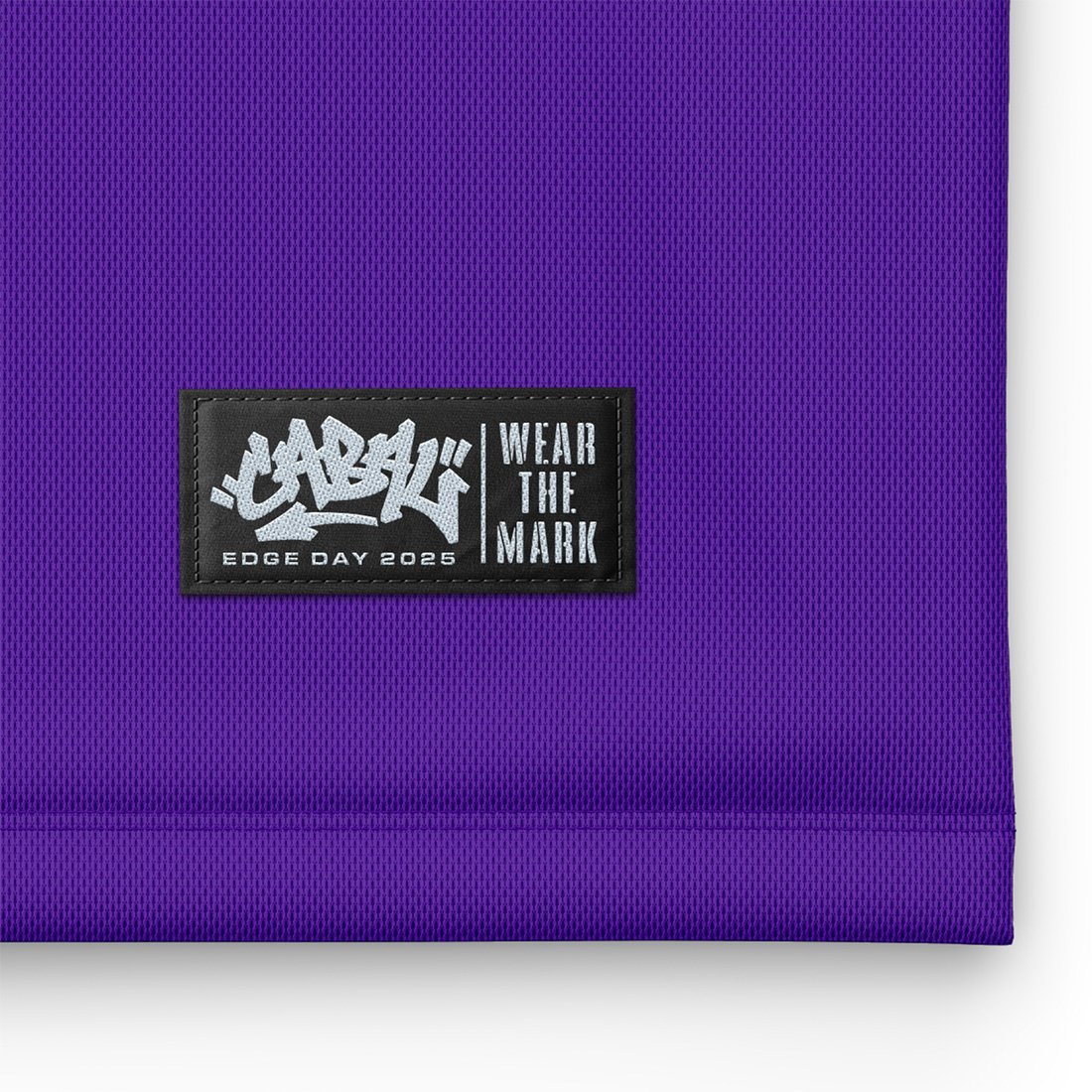 160gr polyester basketball jersey with twill appliqué lettering, woven Edge Day 2025 tag and embroidered Cabal "C" logo on back.